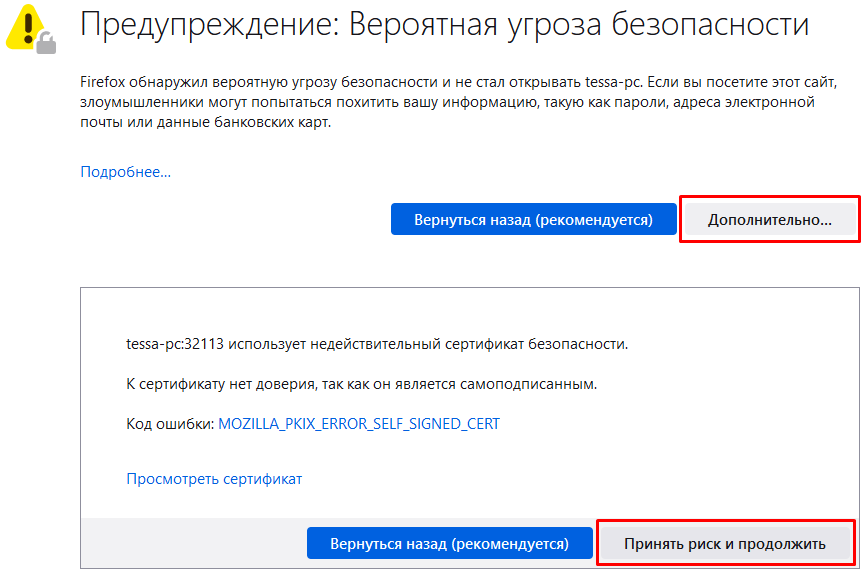 Проверьте, что адрес API-скрипта в карточке настроек Р7-Офис / OnlyOffice корректен и доступен, а также ничего не блокирует его работу”. В таком случае нужно перейти по адресу подключения к api сервера документов (в примере выше это https://tessa-pc:32113/web-apps/apps/api/documents/api.js) и на предупреждение браузера о вероятной угрозе безопасности нажать “Дополнительно” и далее “Принять риск и продолжить”:
