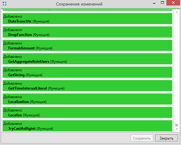 Нажать кнопку Сохранить. Система начнет создавать объекты базы данных и по мере ее работы успешно созданные объекты будут выделяться зеленым. Через несколько секунд, когда все будет завершено, окно будет выглядеть так: