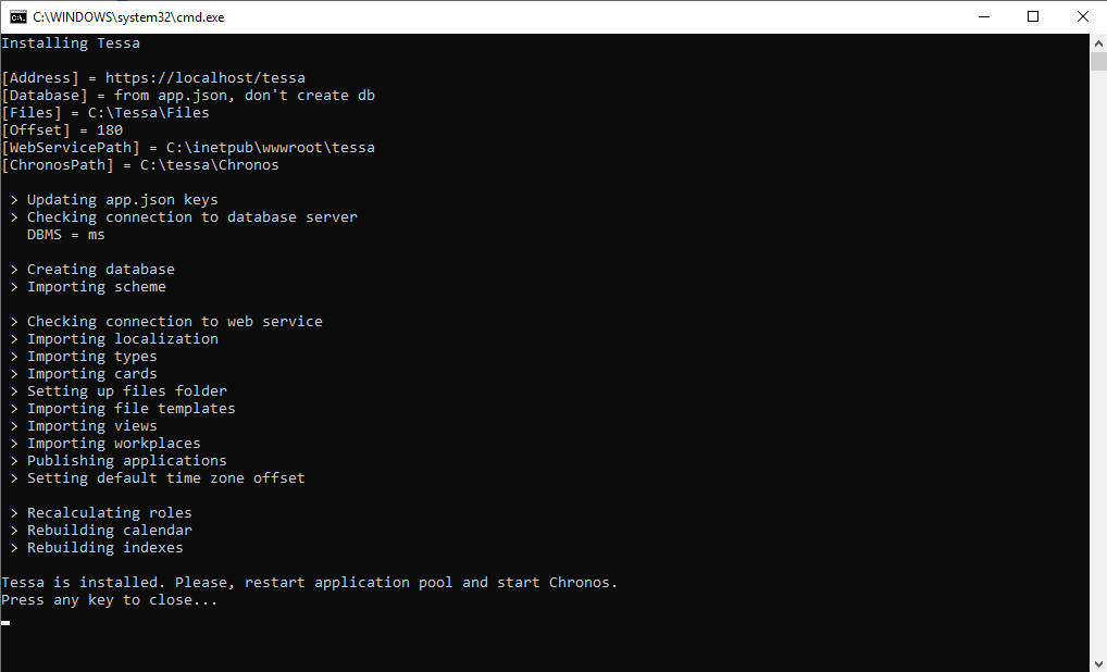 По умолчанию установленная система будет иметь название tessa. Таким же образом будут называться база данных, сайт, пул приложений и файловая директория.