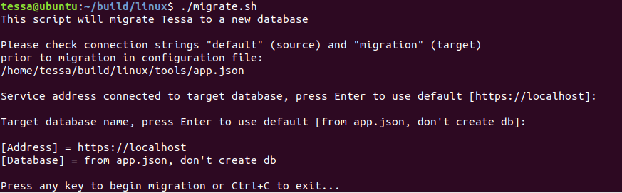 Вы можете перенести/скопировать базу данных TESSA, используя скрипт миграции migrate.sh. Перенос возможен между разными серверами и типами СУБД. Например, из консоли Linux можно подключиться к серверу Microsoft SQL Server, и перенести оттуда базу данных в сервер PostgreSQL, настроив и запустив скрипт миграции.