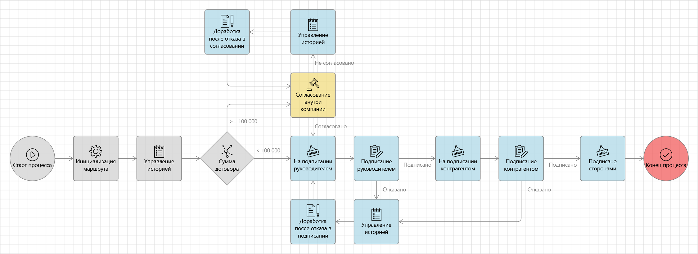 Маршрут, разработанный с помощью Конструктора бизнес-процессов и запущенный по документу, выглядит следующим образом:
