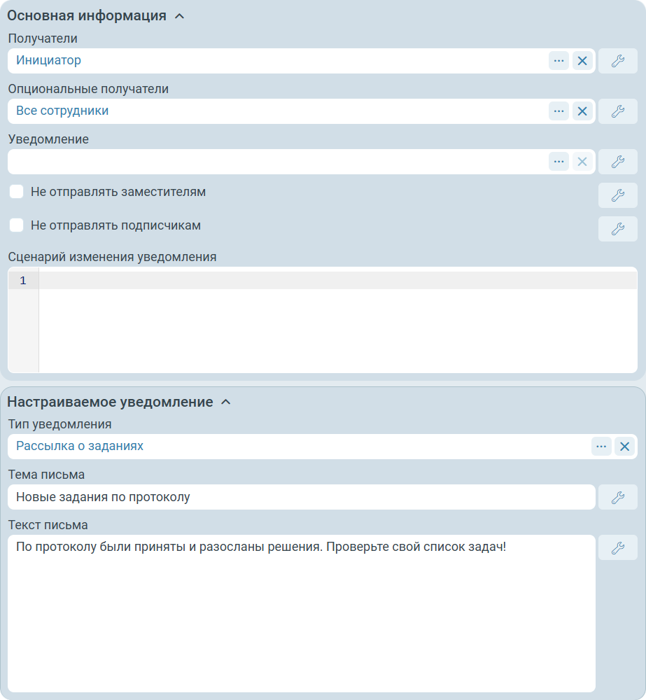 task- объект задания, которое завершается.taskCard- представление строковых секций карточки задания посредствомdynamicполей.taskCardTables- представление табличных секций карточки задания посредствомdynamicполей.notificationInfo(типTessa.Workflow.Actions.WorkflowTaskNotificationInfo) - объект с настройками уведомления, указанными в настройках данного варианта завершения. В сценарии можно переопределить данные настройки, изменив свойства данного объекта.