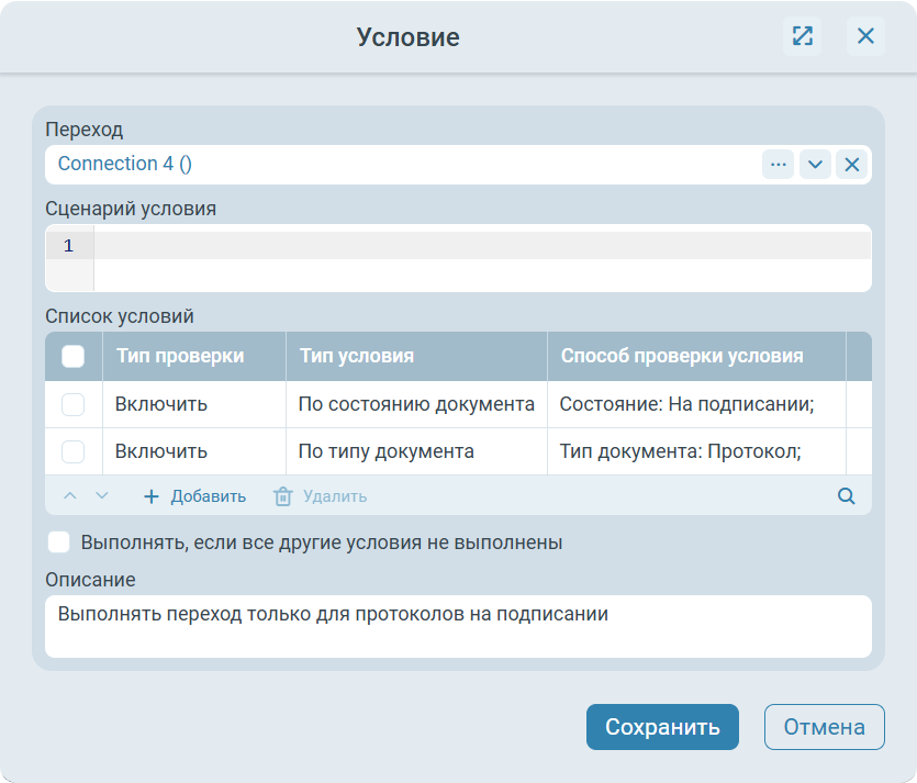 Список условий - таблица с условиями, при выполнении которых осуществляется переход по связи. Не может быть задано, если установлен флаг Выполнять, если другие условия не выполнены.