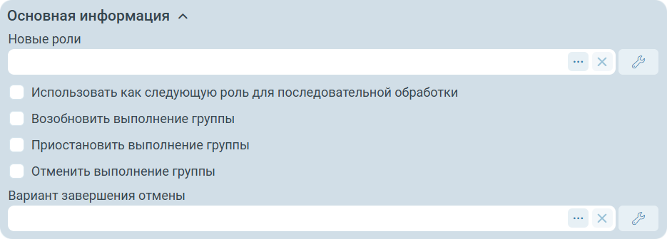 Новые роли - если имеет значение, то роли добавятся в список исполнителей для группы заданий, для которой вызвано управление. Если обработка заданий параллельная и выполнение группы не приостановлено, то задания на данные роли отправятся сразу же. Может быть привязано к параметрам процесса.