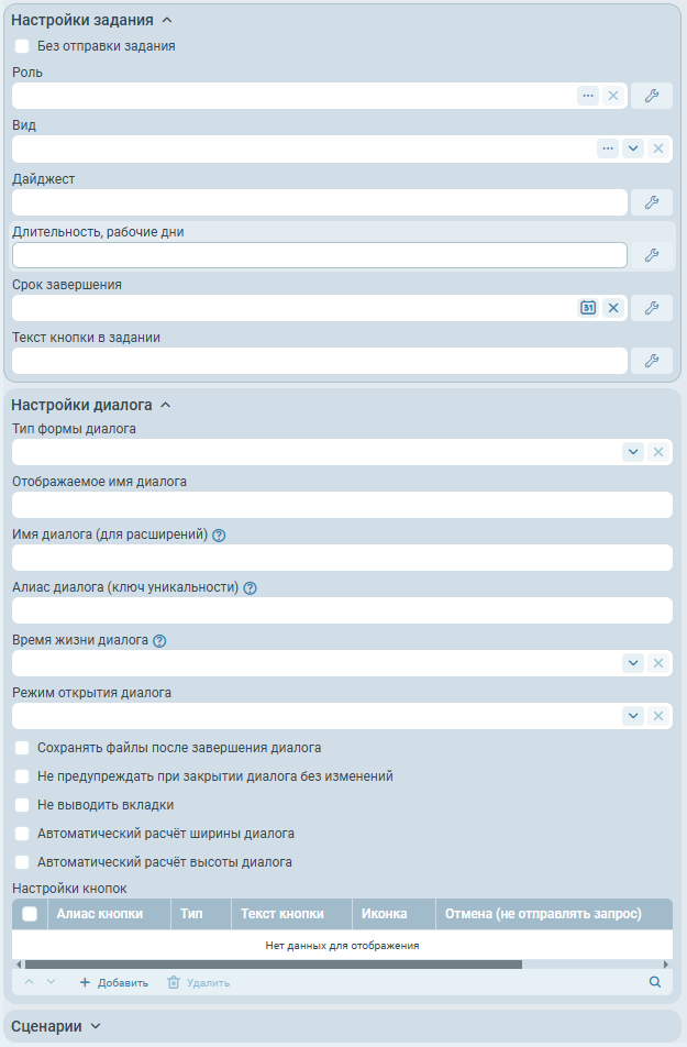 Диалоги - таблица с настройками диалогов, которые должны отображаться при завершении задания с соответствующим вариантом завершения.
