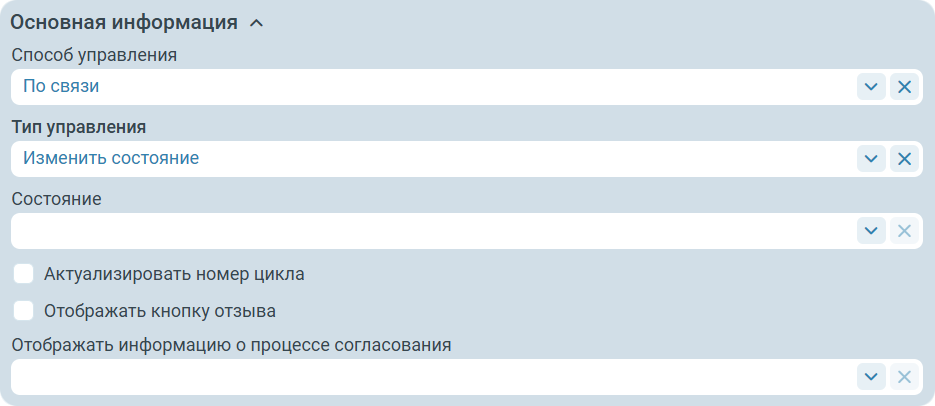 Изменить состояние- выбирается состояние, которое необходимо выставить схеме. При этом при переходе в состояниеВ ожиданиисистема сбросит решения всех согласующих. Также для данного типа управления доступны дополнительные настройки:- Актуализировать номер цикла - при выставленном флаге при смене состояния для схемы, схема будет считывать номер текущего цикла согласования (в соответствии с историей заданий) и корректно отображать его информационного баллоне (из которого открывается схема согласования по документу, отображается в правой верхней части карточки).
