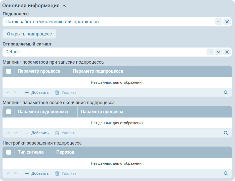 - Отправляемый сигнал - определяет сигнал, отправляемый в подпроцесс. Может быть привязано к параметрам процесса.