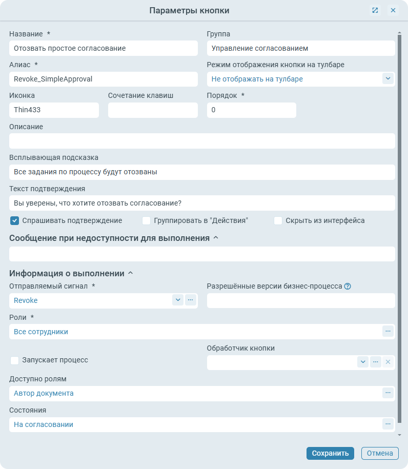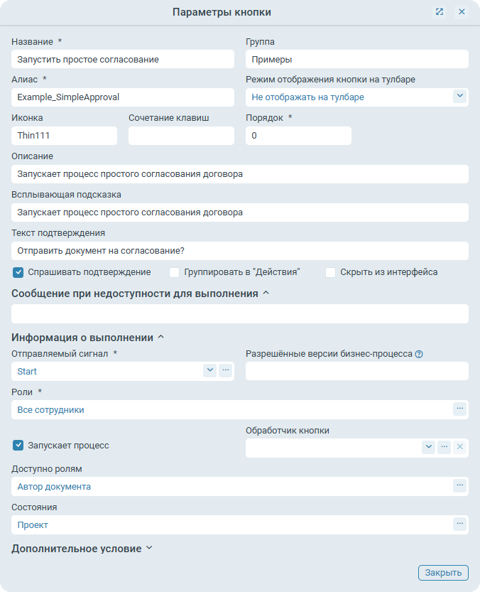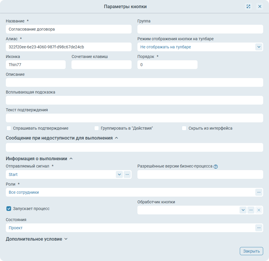 Кнопка бизнес-процесса настроена следующим образом:
