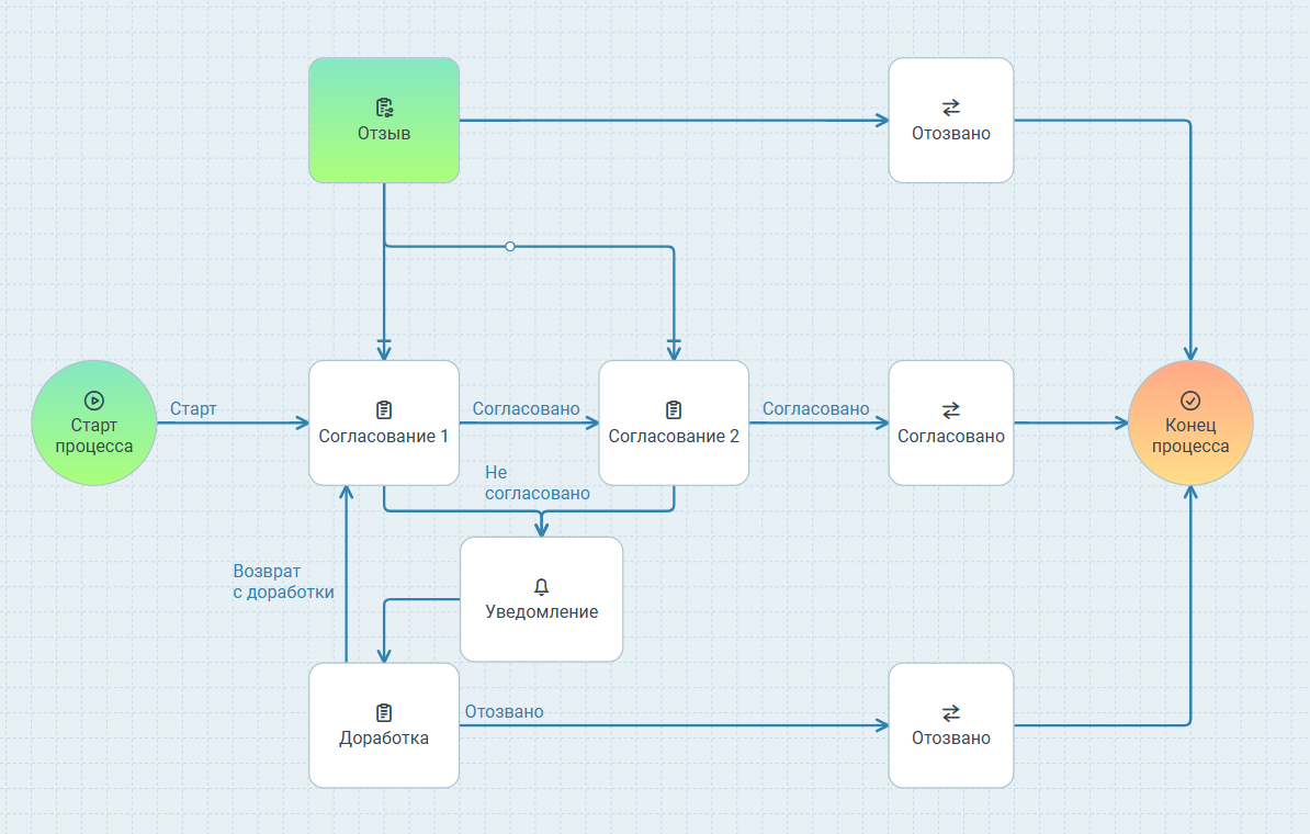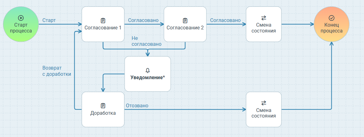 Также рекомендуется реализовать отправку уведомлений при получении задания на доработку. Это можно сделать, добавив новый узел с действием Уведомление перед узлом Доработка.