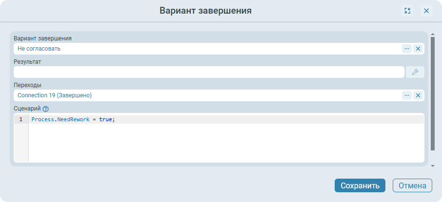 Таким образом при завершении задания с данным вариантом завершения будет осуществлена отправка заданий на доп. согласование на исполнителей, указанных в секции WfResolutionPerformers, а при завершении заданий с другим вариантом завершения будет производиться отзыв отправленных, но не завершенных, заданий доп. согласования.