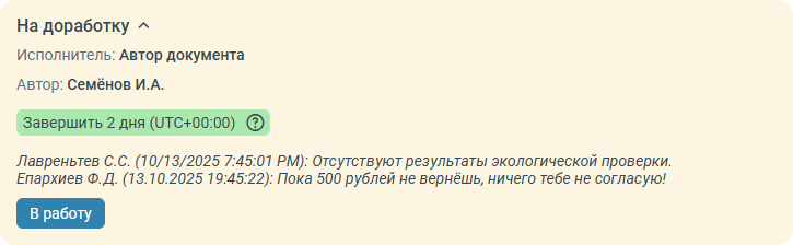 После взятия в работу задания доработки и нажатия кнопки Начать новый цикл система начнёт новый цикл согласования, задание снова окажется на подписании руководителем.