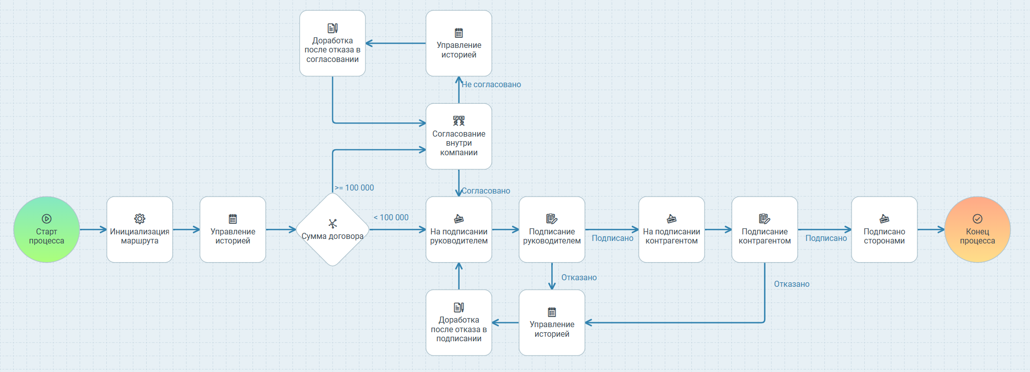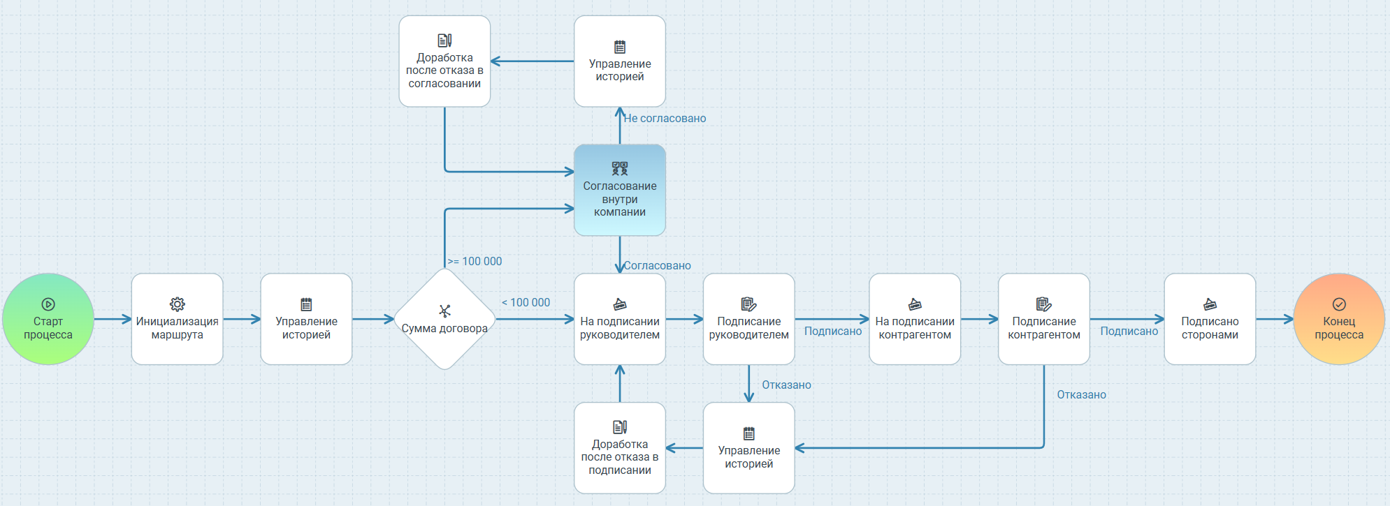 100 000, то после запуска процесса он будет отправлен на согласование, если сумма договора не указана, то она считается меньше100 000. В таком случае он сразу попадёт на подписание. -
