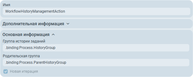 Все действия типа Управление историей в данном процессе имеют следующие параметры: