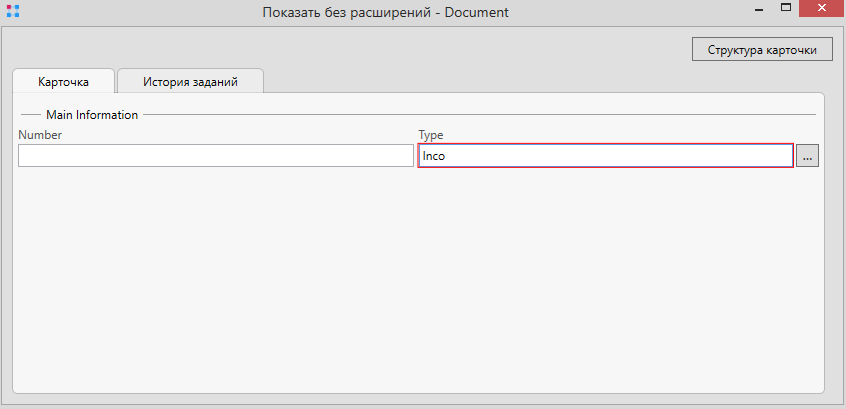- Показать без расширений – отображает карточку без расширений, т.е. в строгом соответствии с установленными в редакторе типов свойствами.