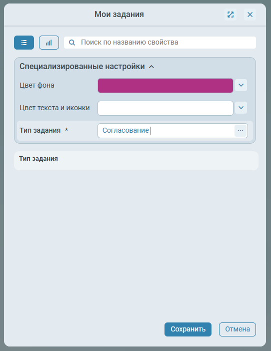 • Пользователь в настройках виджета задает определенный тип задания, фильтр по которому будет применен в представлении.