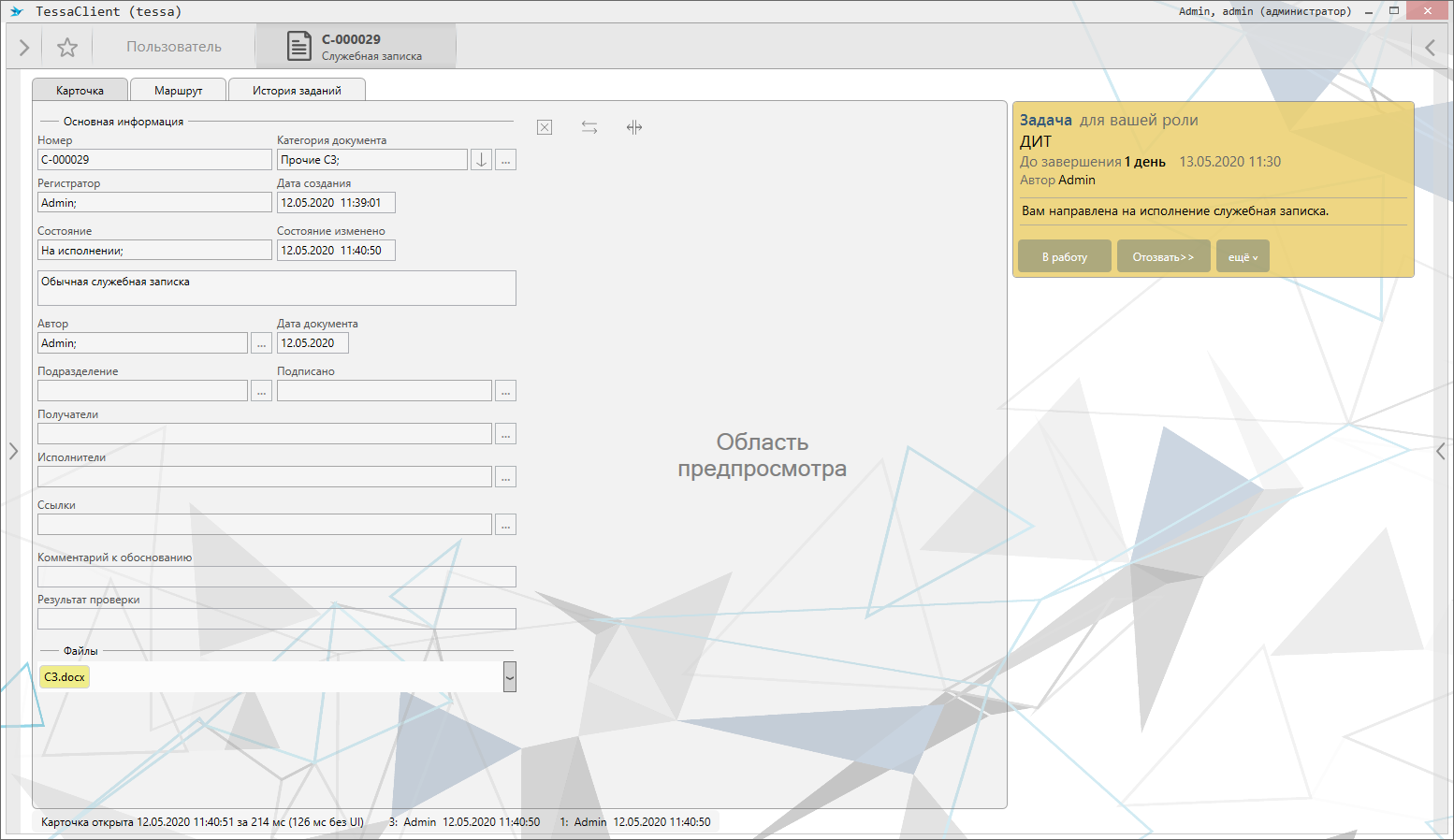 И система немедленно присылает нам задание на исполнение заявки. Для удобства текущий сотрудник включен во все роли процесса, но в реальной жизни эти роли выполняют разные люди.