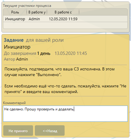 Если инициатор не подтверждает выполнение заявки, то система вновь отправляет задание исполнителю заявки с комментарием недовольного инициатора.