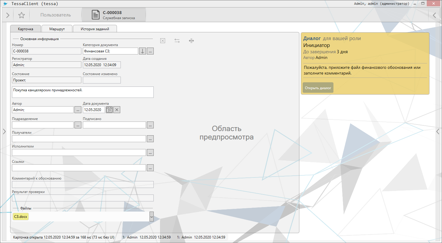 Для примера, система настроена таким образом, что приложенные в диалоге “Предоставление обоснования” файлы прикладываются в карточку документа и введённый комментарий к финансовому обоснованию записывается в поле “Комментарий к обоснованию”: