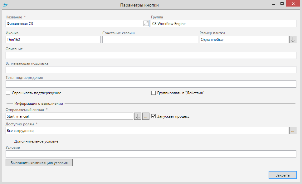 Добавьте кнопку бизнес-процесса “Финансовая СЗ” и настройте её как показано на рисунке: