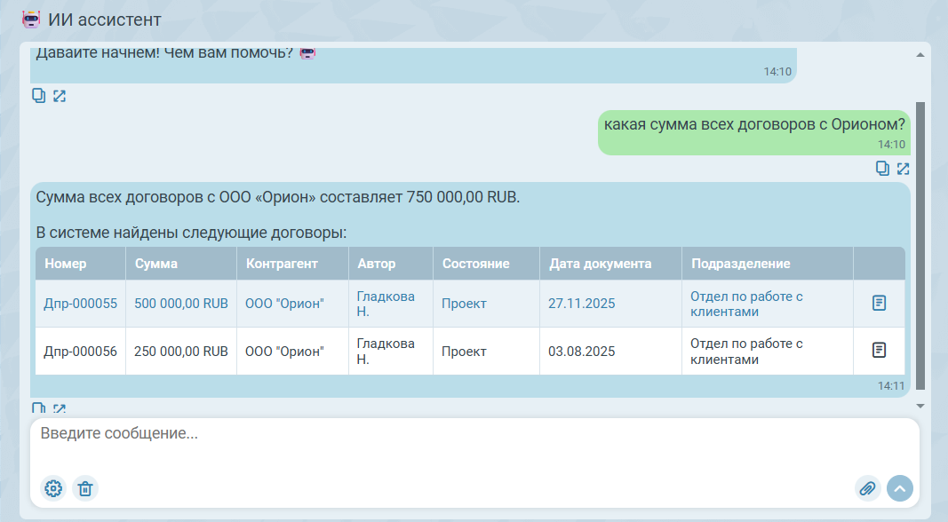 Каждая из строк таблицы в ответном сообщении ассистента является кликабельной, двойным кликом по ней можно перейти в карточку договора.