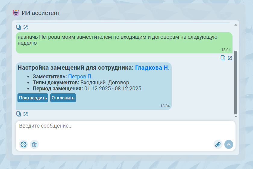 Для того, чтобы назначить своего заместителя, необходимо написать соответствующий запрос в чате. Если при этом в тексте запроса указать даты начала и окончания замещения, они будут учтены ИИ ассистентом, а в случае, если даты не указаны пользователем, будет предложен формат постоянного замещения. Добавленный таким образом сотрудник получит все права доступа, которые были у замещаемого сотрудника.