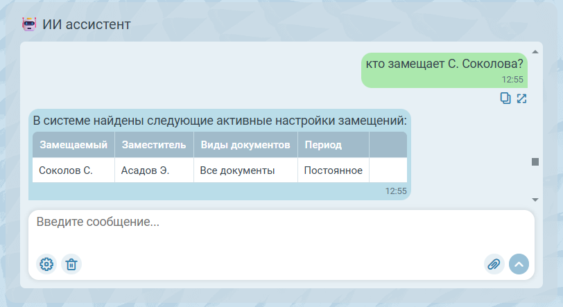 Помимо настройки замещений, ИИ ассистенту можно задать вопрос об уже настроенных активных замещениях - как собственных, так и относящихся к другим сотрудникам. В ответном сообщении будет указана фамилия замещающего сотрудника, даты замещения, а также типы документов, по которым настроено замещение.