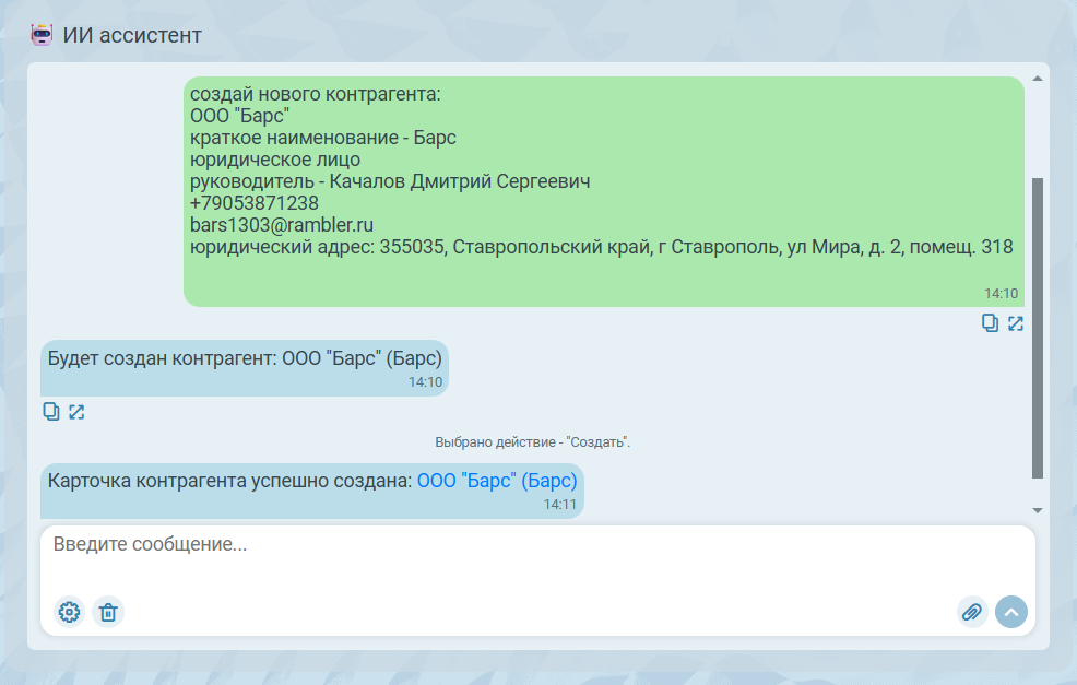 Нажатие кнопки Отклонить в ответном сообщении ассистента прерывает создание контрагента. Пользователь может отправить новое сообщение в рамках текущего инструмента.