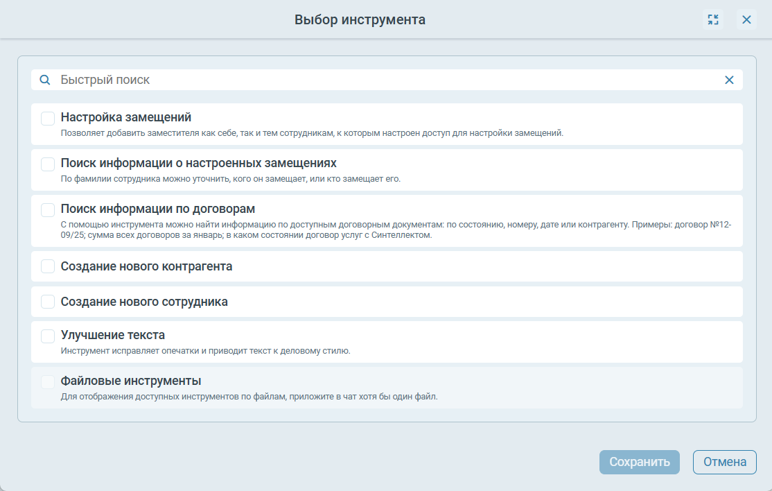 Ручной выбор инструмента не является обязательным. В большинстве случаев система может сама определить инструмент для реализации запроса пользователя, для этого ему достаточно описать в чате желаемое действие: попросить ассистента настроить замещение, найти нужный договор, задать вопрос по содержанию документа и т.д.
