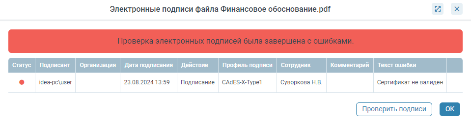В случае, если проверка пройдет не успешно, в колонке статус подпись отметится красным и будет отображен текст ошибки.