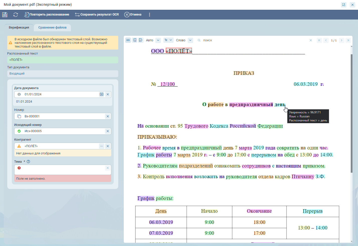 Если в исходном файле были найдены текстовые данные, то на вкладке Верификация будет отображено соответствующее сообщение. На вкладке Сравнение файлов имеется возможность сравнить исходный файл с распознанным. Для этого необходимо выбрать пункт контекстного меню Сравнить с исходным файлом на строке в таблице Запросы на распознавание.