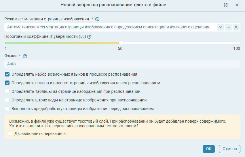 При открытии карточки операции OCR начальные значения полей соответствуют тем значениям, которые были установлены в исходной карточке. Если изменить значение поля в исходной карточке, то оно будет изменено и в карточке операции OCR. Если же изменить значение поля в самой карточке операции OCR, то оно уже не будет копироваться из исходной карточки. При нажатии на кнопку Сохранить результат OCR в исходную карточку будут скопированы только те поля, которые были хотя бы раз изменены в карточке операции OCR.