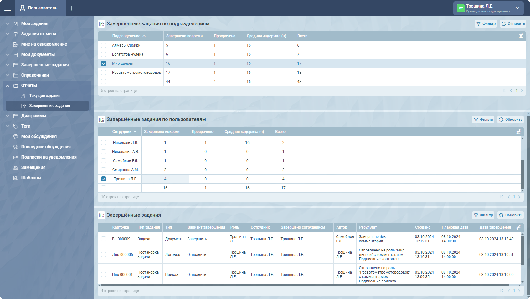 - Завершённые задания по пользователям – количество завершенных заданий по каждому доступному сотруднику в выбранном подразделении;
