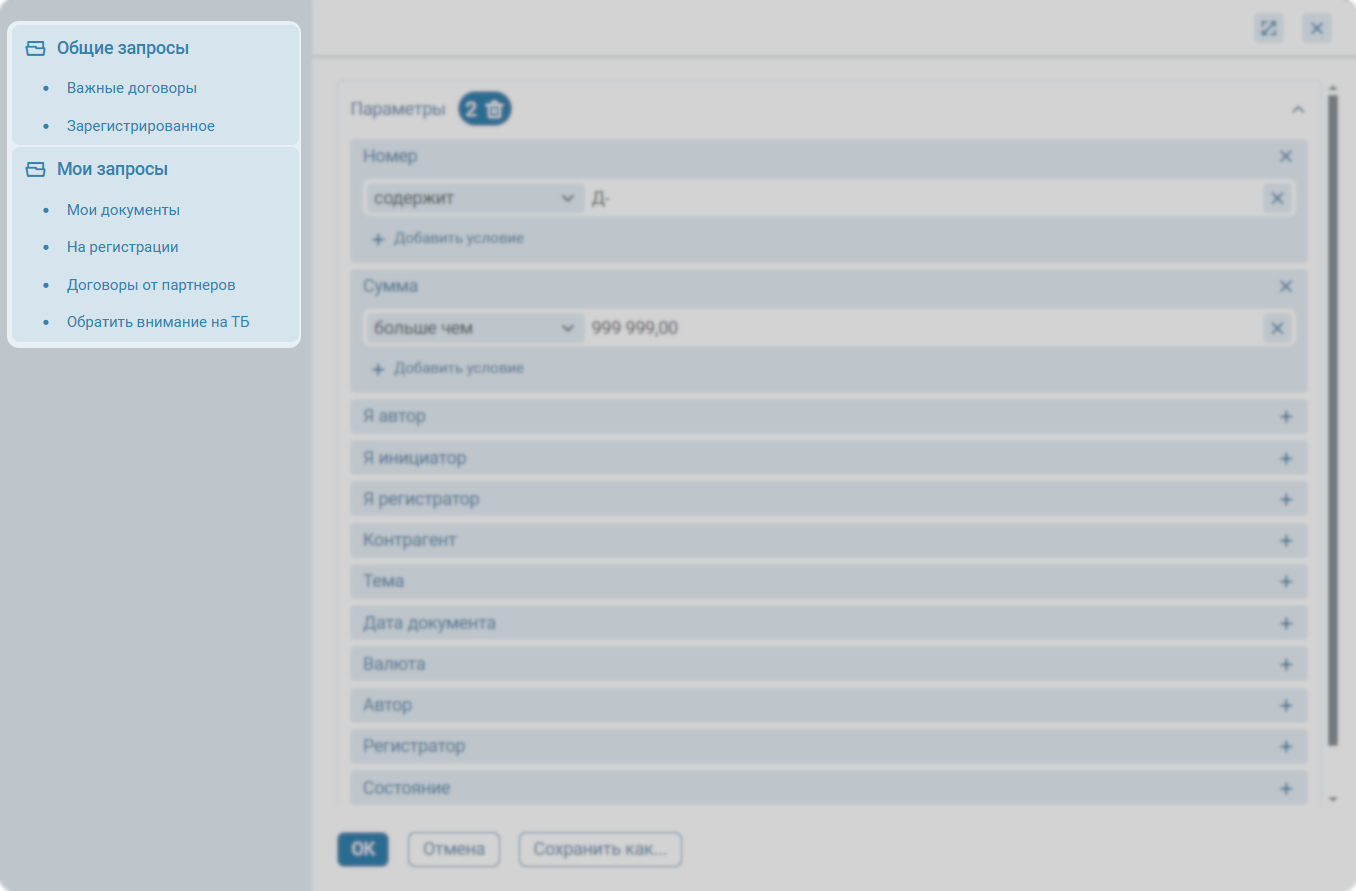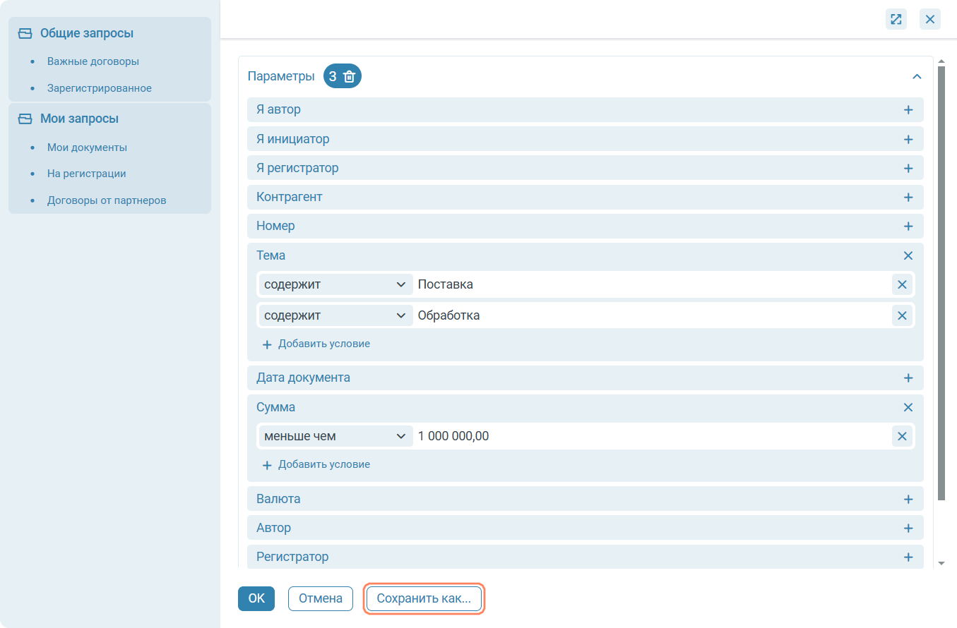 У пользователя есть возможность сохранить часто используемые поисковые запросы. В окне настройки фильтрации необходимо указать параметры фильтрации, после чего нажать кнопку Сохранить как….