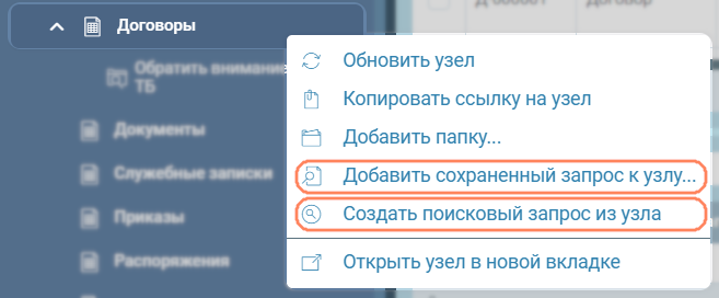 Чтобы добавить поисковый запрос в дерево, необходимо выбрать в контекстном меню на любом узле пункт Добавить сохранённый запрос.