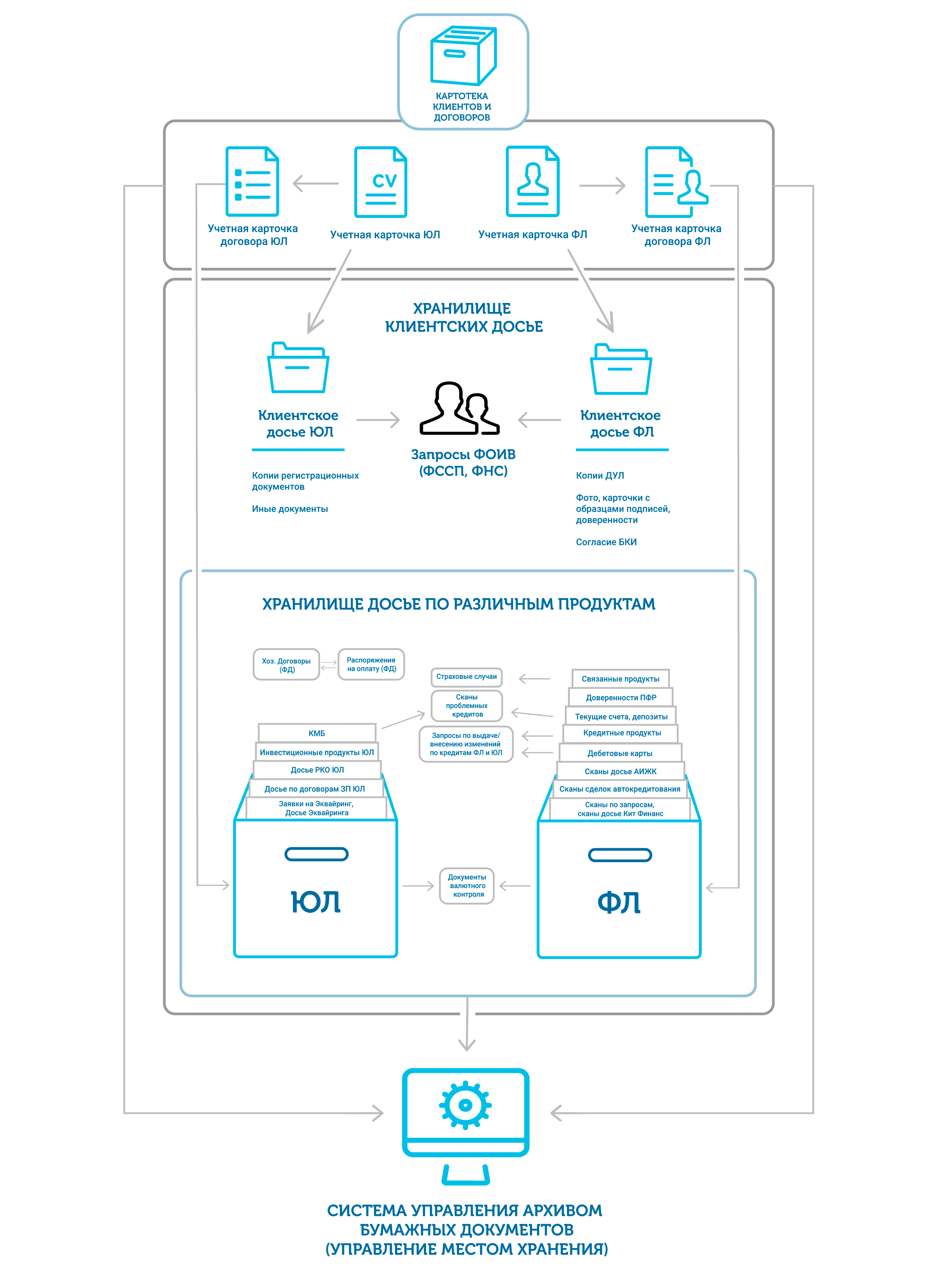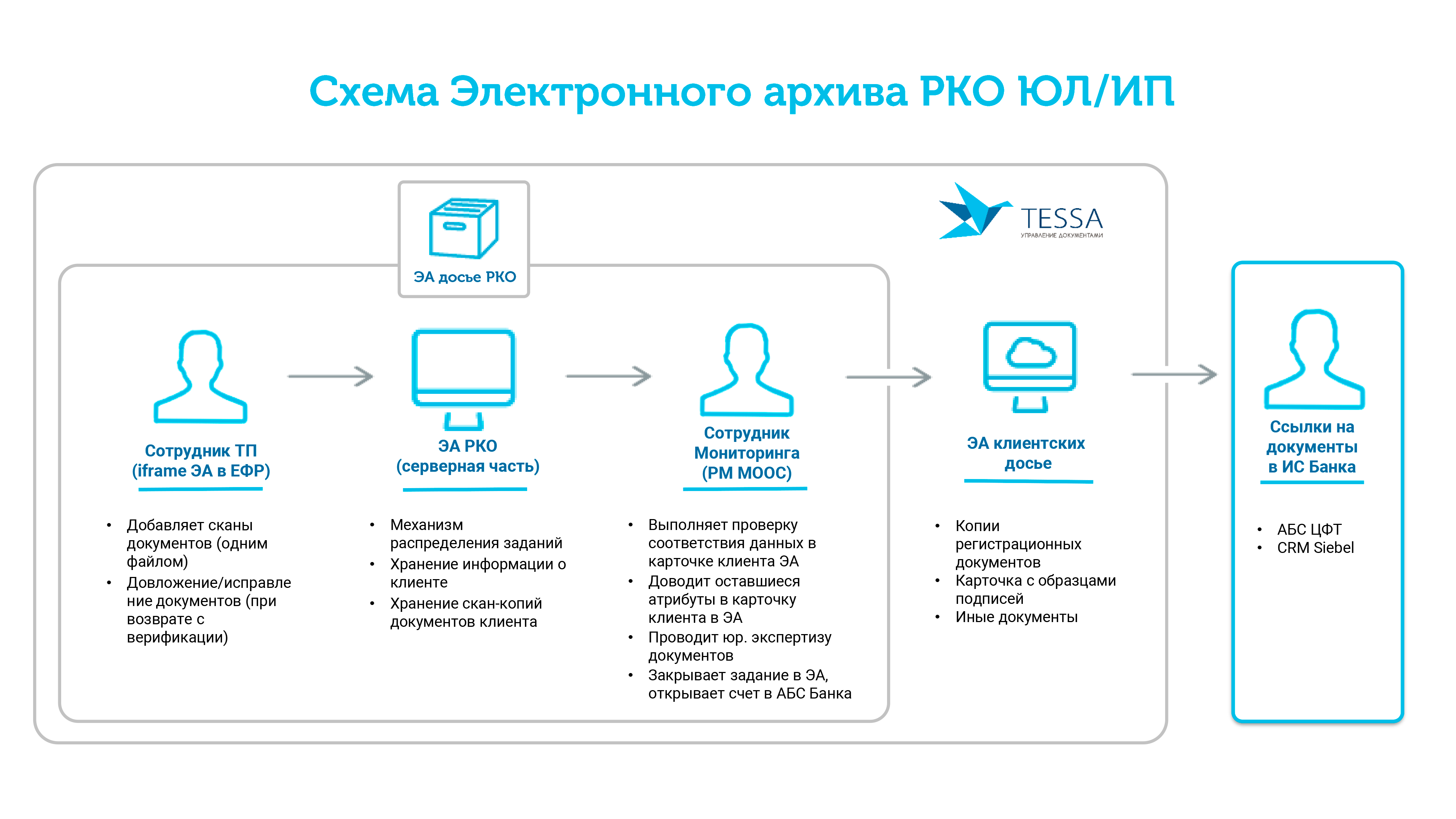 Хранилище структурированных данных по всем клиентам банка (физическим лицам) и банковским продуктам. Часть документов (например, копии документов, удостоверяющих личность для физ. лиц) хранятся в банке исключительно в электронном виде в СЭД TESSA, а часть документов поступает в электронный архив в результате сканирования оригиналов документов по запросам, поступающим из подразделений. В электронном архиве реализован поиск документов по различным параметрам в разрезе клиентов или продуктов, а также реализованы связи между продуктами.
