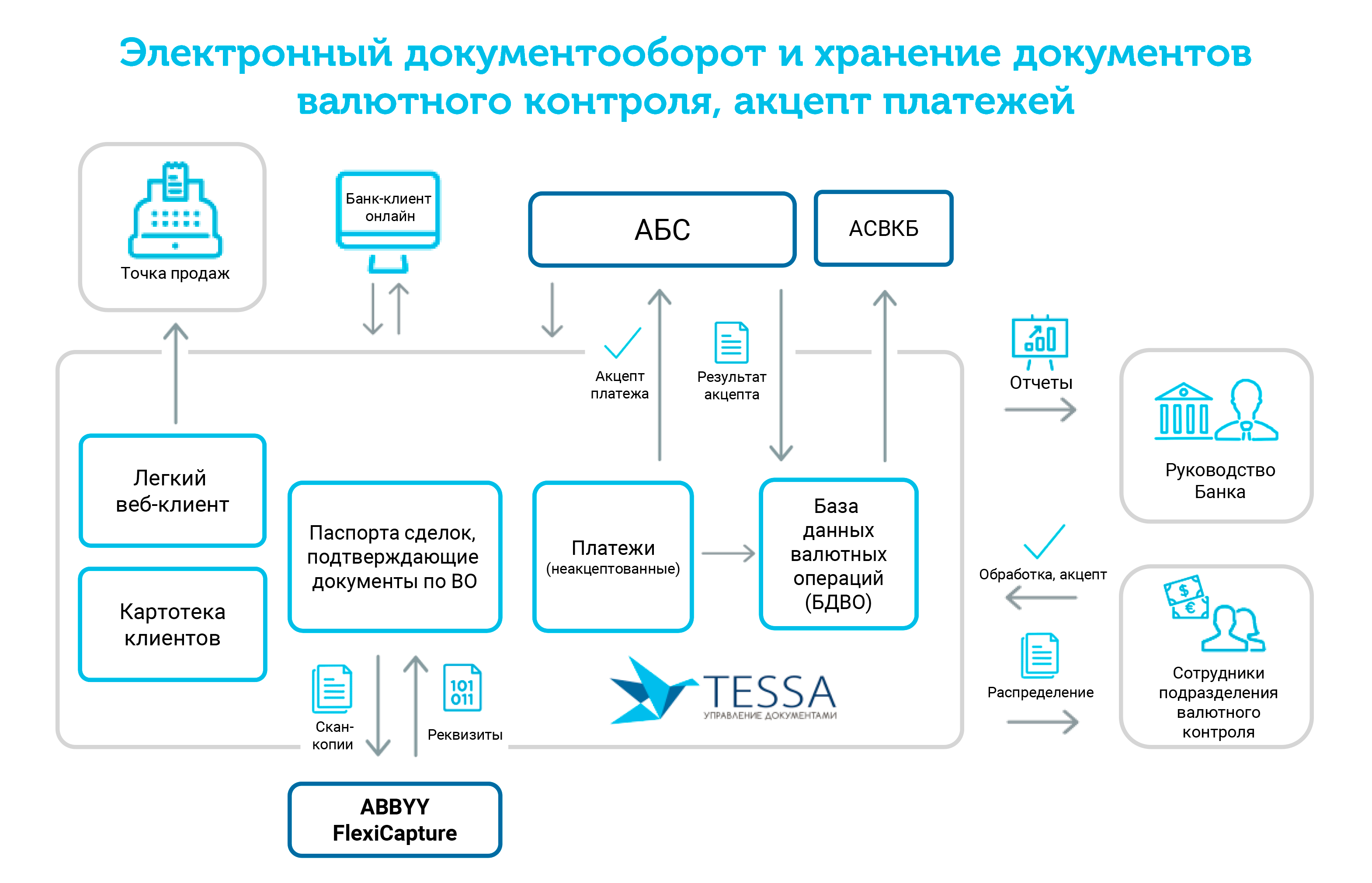 Из учетной банковской системы в TESSA поступает информация по валютным сделкам Банка. Из точек продаж банка (с использованием технологии тонкого клиента) или из системы «Банк-клиент онлайн» (БКО) направляются документы по валютной сделке. Сканированные образы документов передаются в систему распознавания с использованием ПО Abbyy FlexiCapture, где документ автоматически идентифицируется и прикрепляется к нужной карточке в электронном архиве. Далее документы распределяются для обработки сотрудникам отдела валютного контроля (ОВК) банка в соответствии с настраиваемыми правилами. Сотрудники ОВК — валютные контролеры проводят обработку документов по паспортам сделок, ставят отметку об исполнении или направляют на доработку. Сотрудники точек продаж или сам клиент через БКО в любой момент может проверить статус обработки документа.