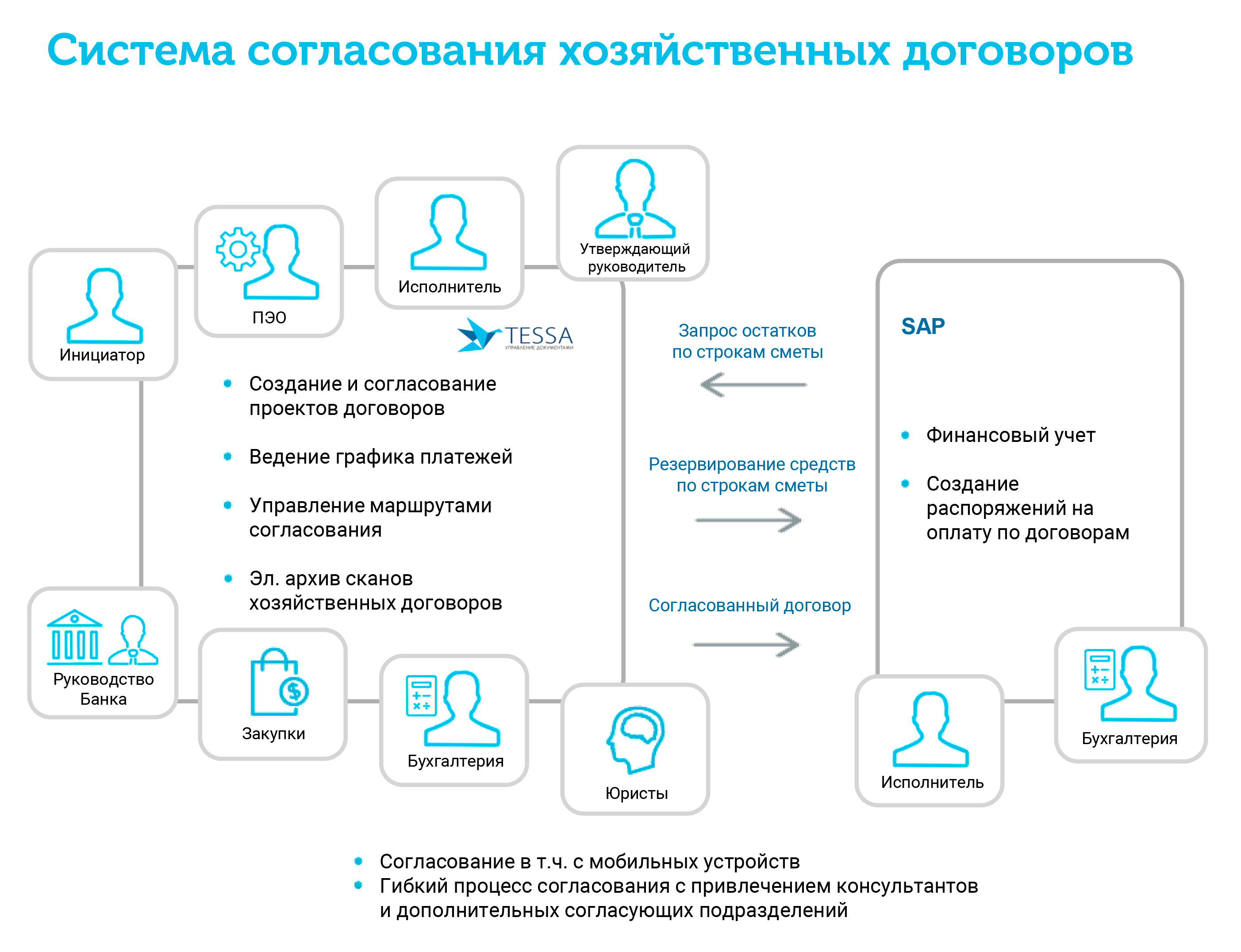 Включает в себя электронное хранилище договоров по хозяйственной деятельности и автоматизированный бизнес процесс маршрутизации и согласования договорной документации подразделениями банка.