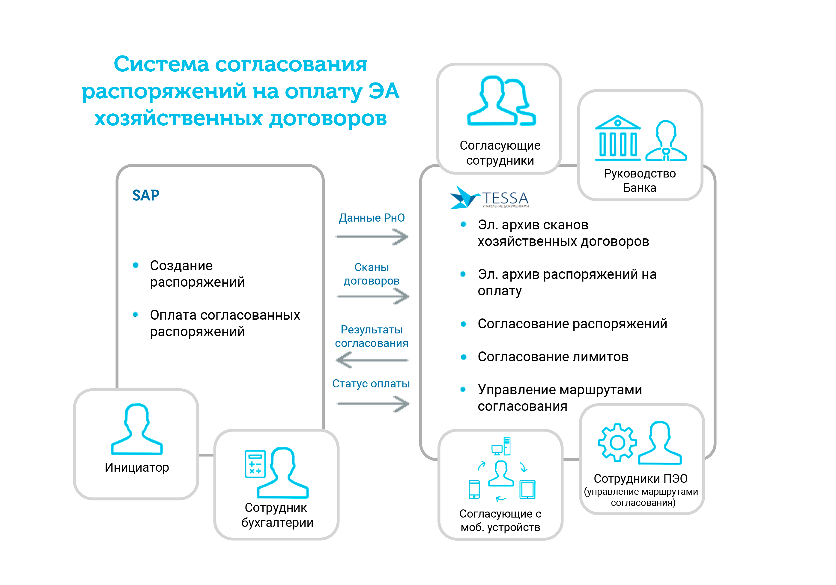 Система тесно интегрирована с финансовой учетной системой банка на базе SAP: в частности, создание распоряжения на оплату и, непосредственно, оплата производятся в SAP, а процедура электронного согласования распоряжений и сопроводительных документов происходит в TESSA.