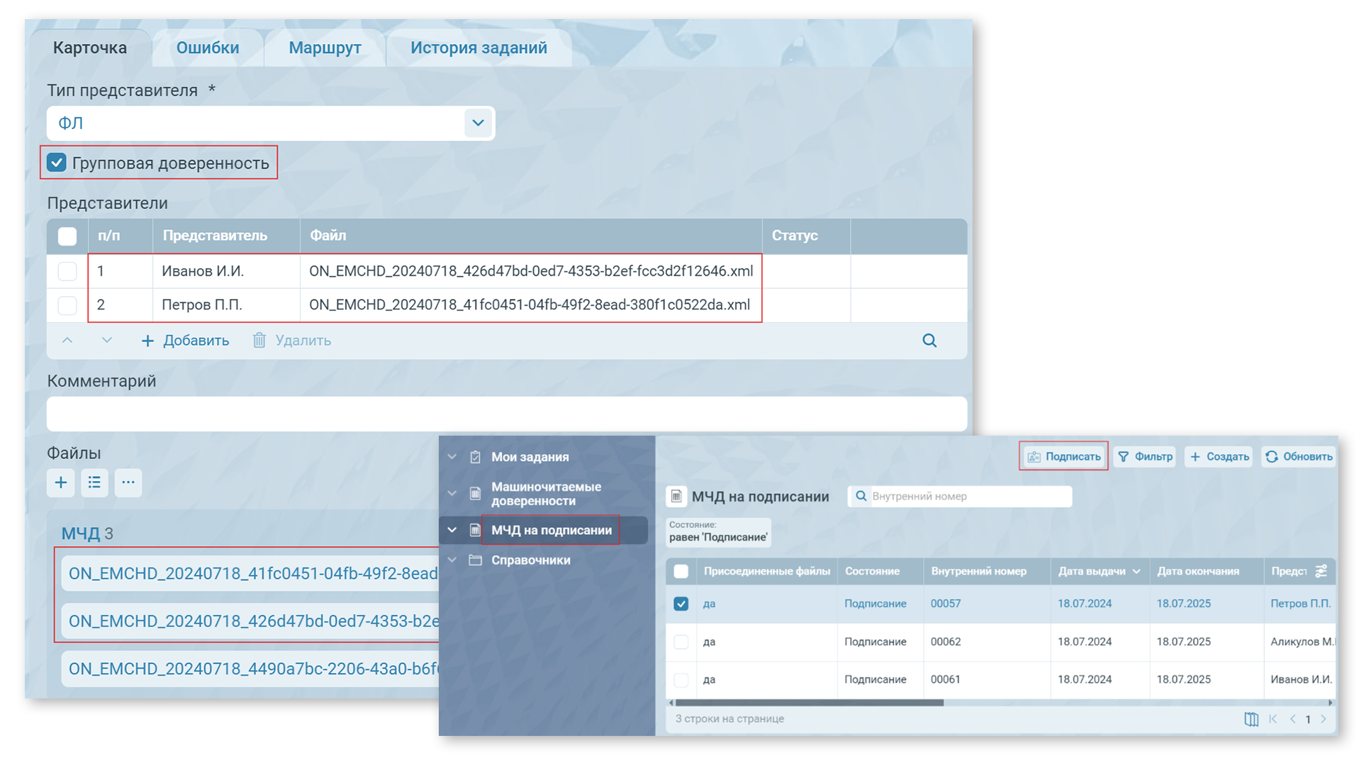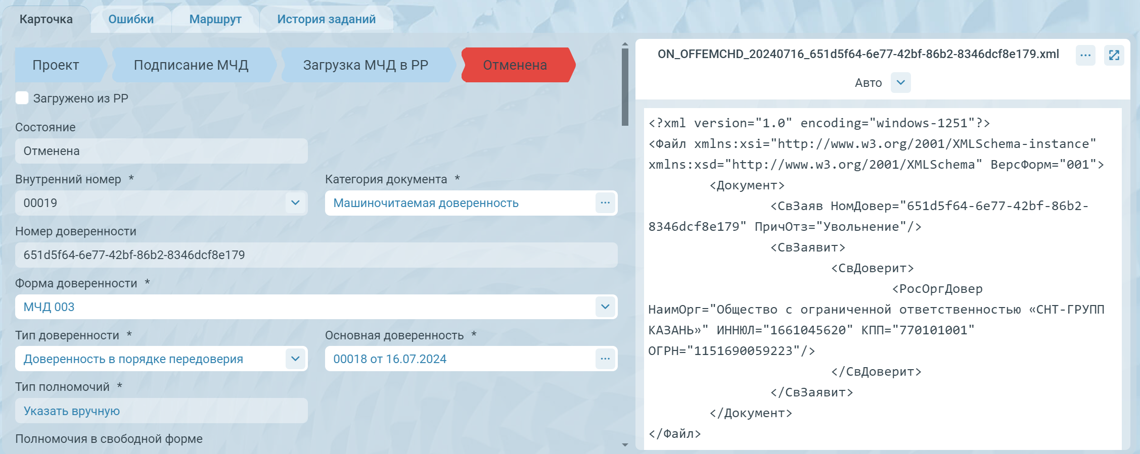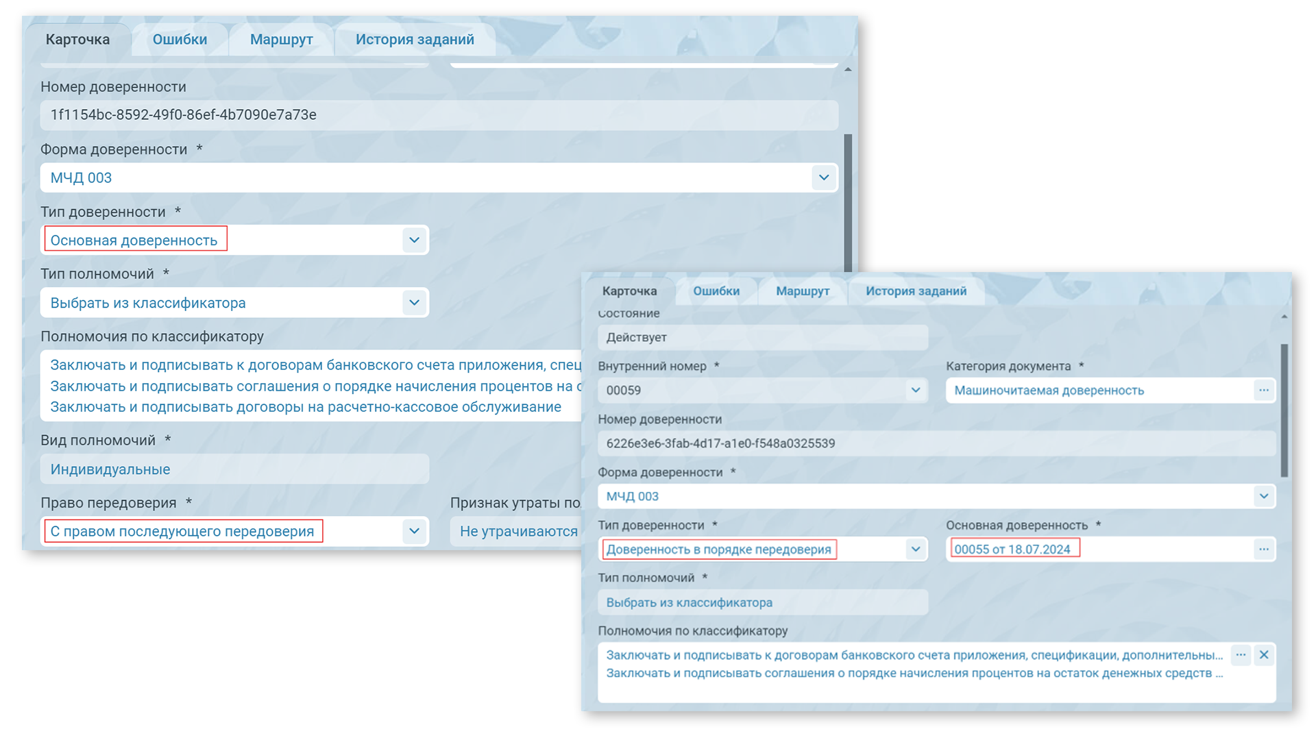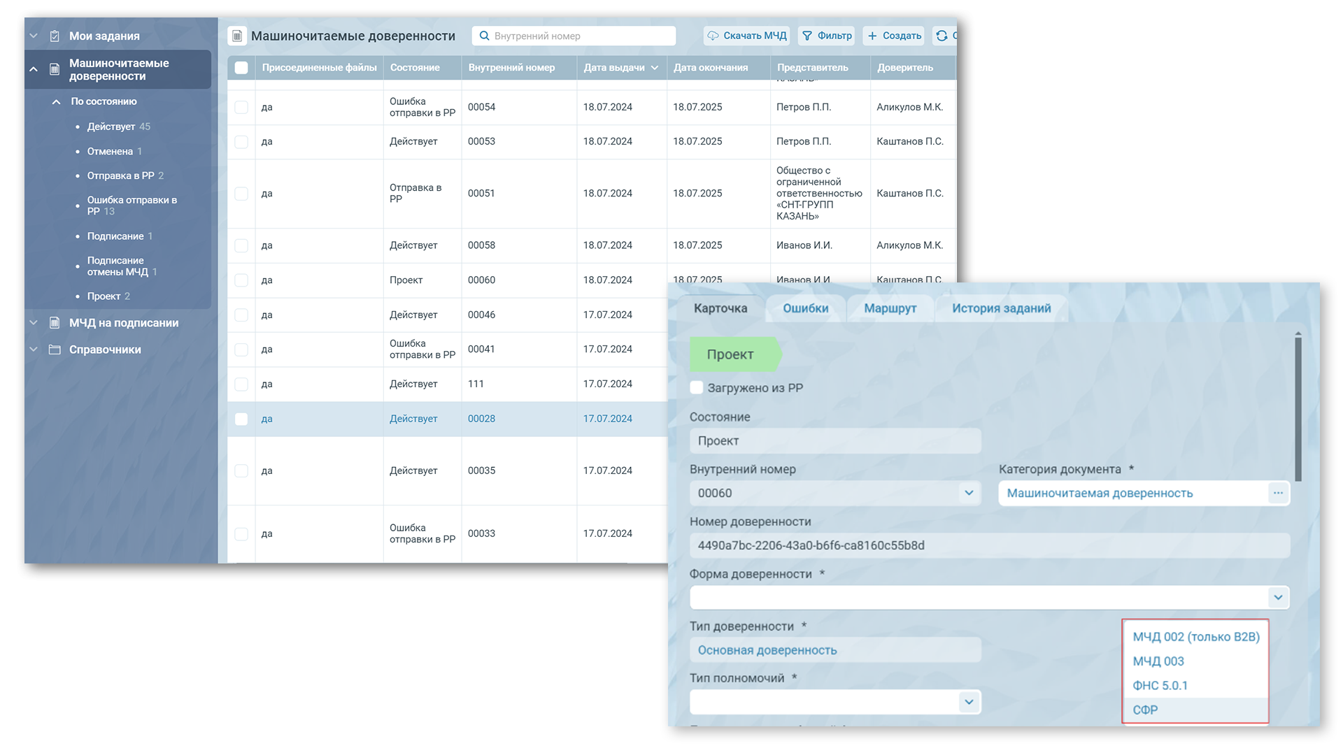 В силу специфики деятельности компании было важно реализовать функционал передоверия, и в этой части модуль МЧД закрывает все потребности. В систему из распределенного реестра подгружается генеральная доверенность, которую выпускает обслуживаемая компания. Далее на базе этой доверенности создается карточка «Передоверие», которая подписывается в системе Генеральным директором ЦКР, после чего автоматически отправляется в реестр ФНС на регистрацию.