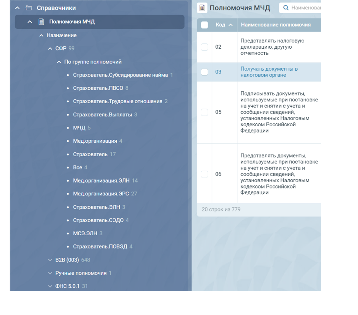 В классификаторе есть полномочия как B2B для 2-го и 3-го форматов, так и ФНС, СФР и т.д. Классификатор удобен тем, что он имеет иерархическую структуру, с разными группировками и быстрым поиском необходимых полномочий. При формировании МЧД в TESSA идентификатор вставляется автоматически, но также его можно посмотреть в классификаторе полномочий МЧД. Все данные своевременно актуализируются и обновляются на основании данных, представленных на портале ЕСНСИ. Есть возможность ввода своих полномочий в справочник для быстрого заполнения полномочий в свободной форме.