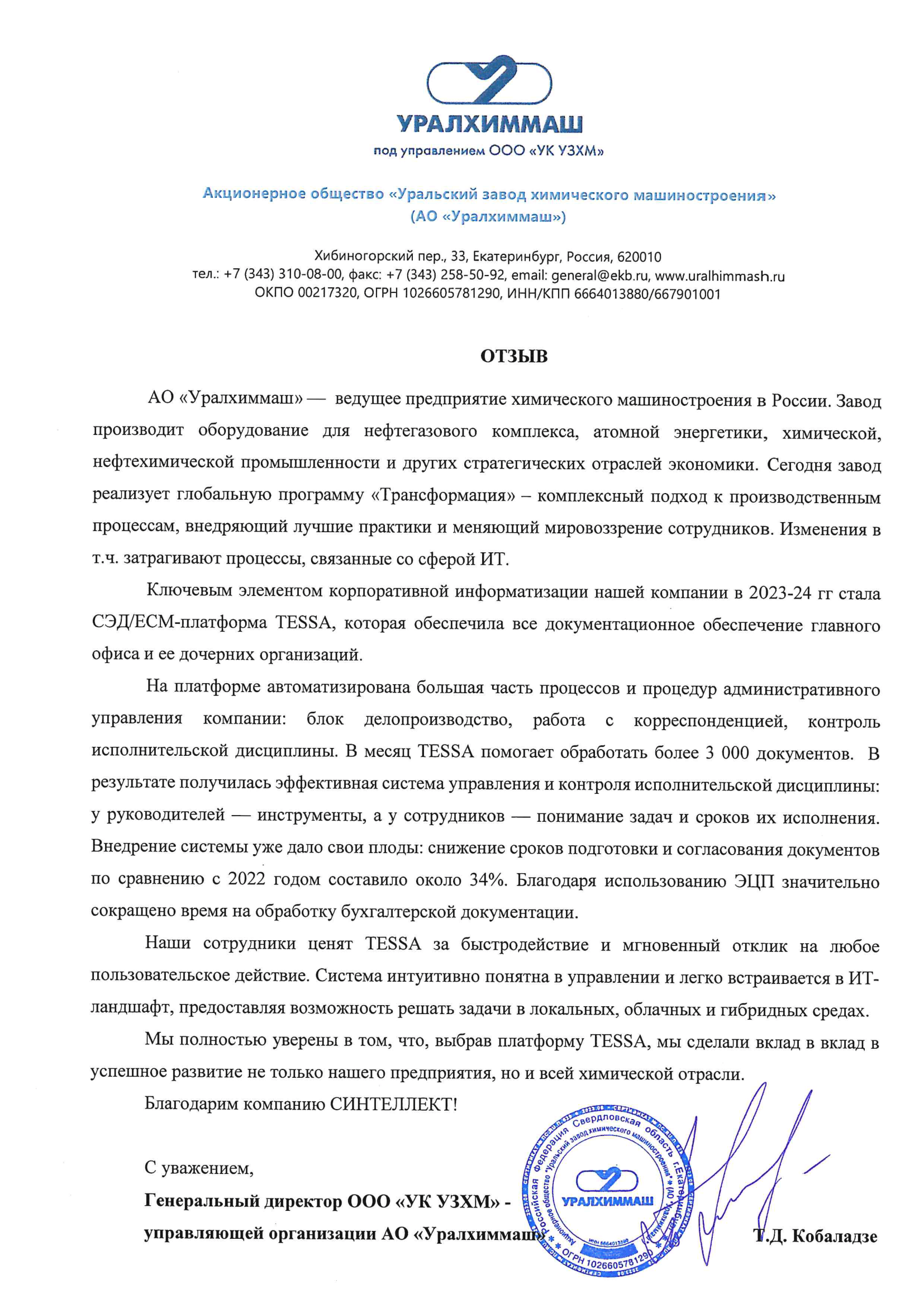 С уважением, Генеральный директор ООО «УК УЗХМ», управляющей организации АО «Уралхиммаш», Т.Д. Кобаладзе
