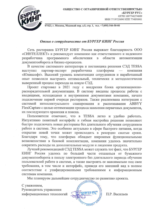 Сеть ресторанов БУРГЕР КИНГ Россия выражает благодарность ООО «СИНТЕЛЛЕКТ» и рекомендует компанию как ответственного и надежного разработчика программного обеспечения в области автоматизации документооборота и бизнес-процессов.