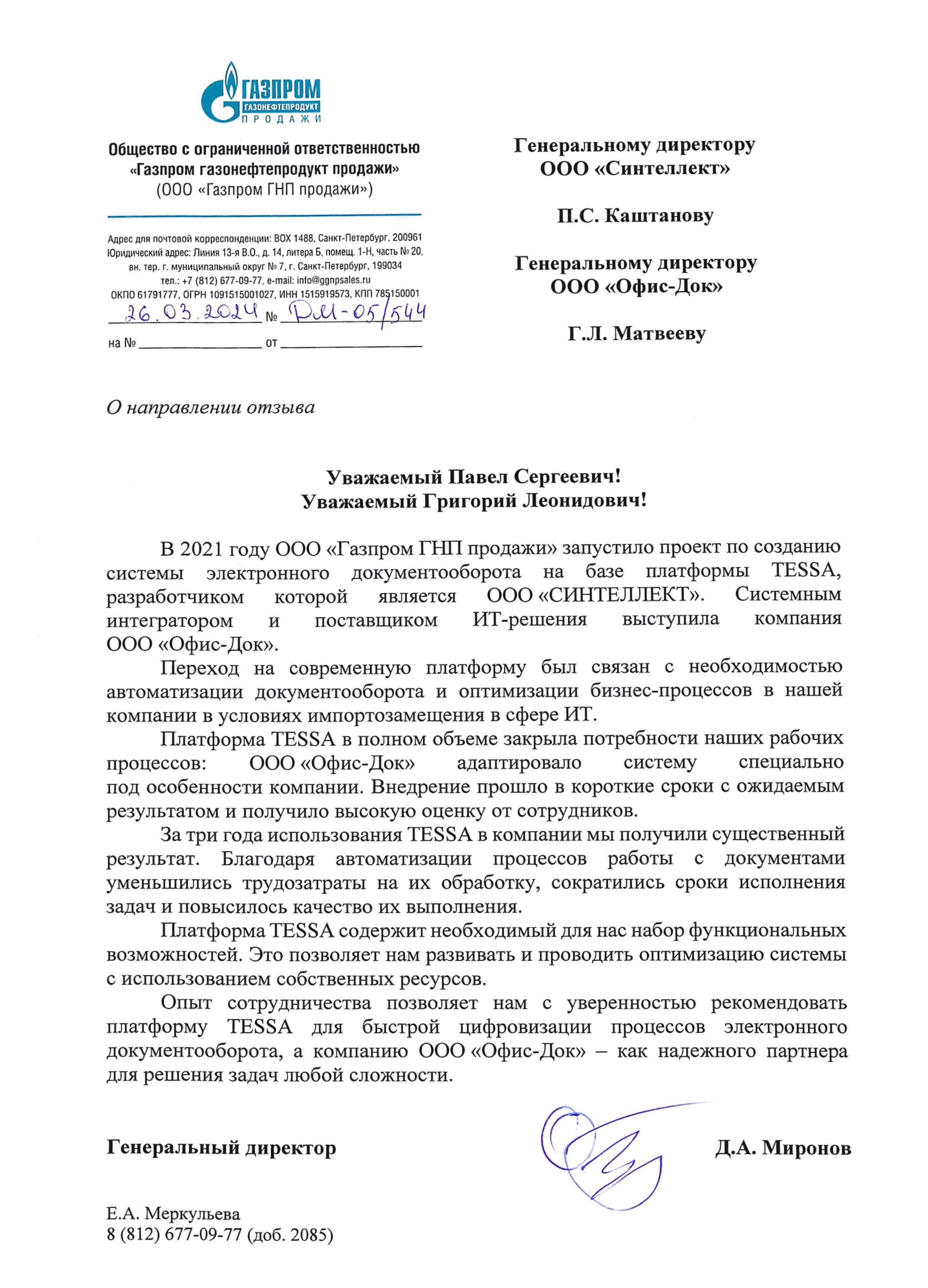 В 2021 году ООО «Газпром ГНП продажи» запустило проект по созданию системы электронного документооборота на базе платформы ТЕSSА, разработчиком которой является ООО «СИНТЕЛЛЕКТ». Системным интегратором и поставщиком ИТ-решения выступила компания ООО «Офис-Док».