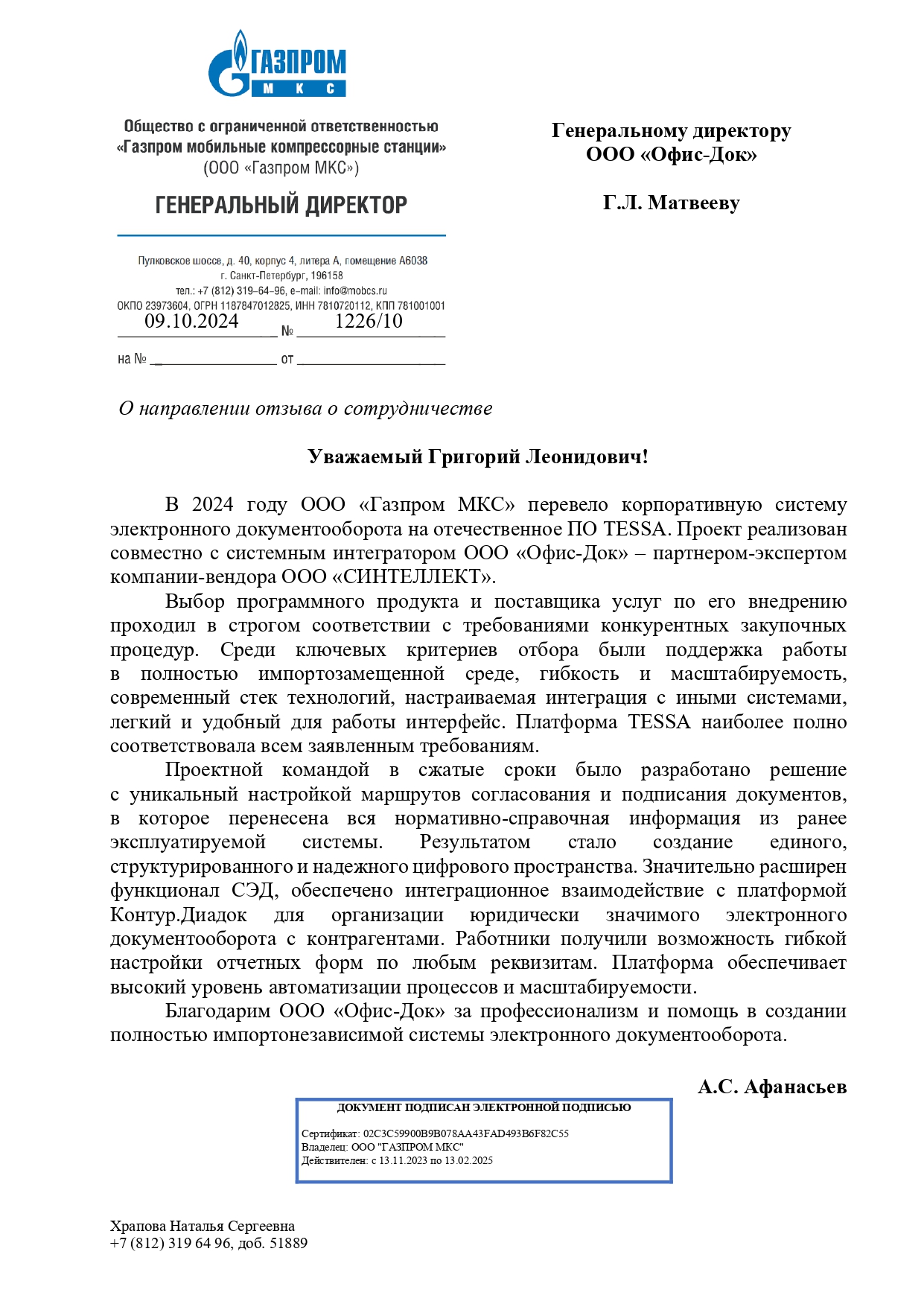 В 2024 году ООО «Газпром МКС» перевело корпоративную систему электронного документооборота на отечественное ПО TESSA. Проект реализован совместно с системным интегратором ООО «Офис-Док» — партнером-экспертом компании-вендора ООО «СИНТЕЛЛЕКТ».