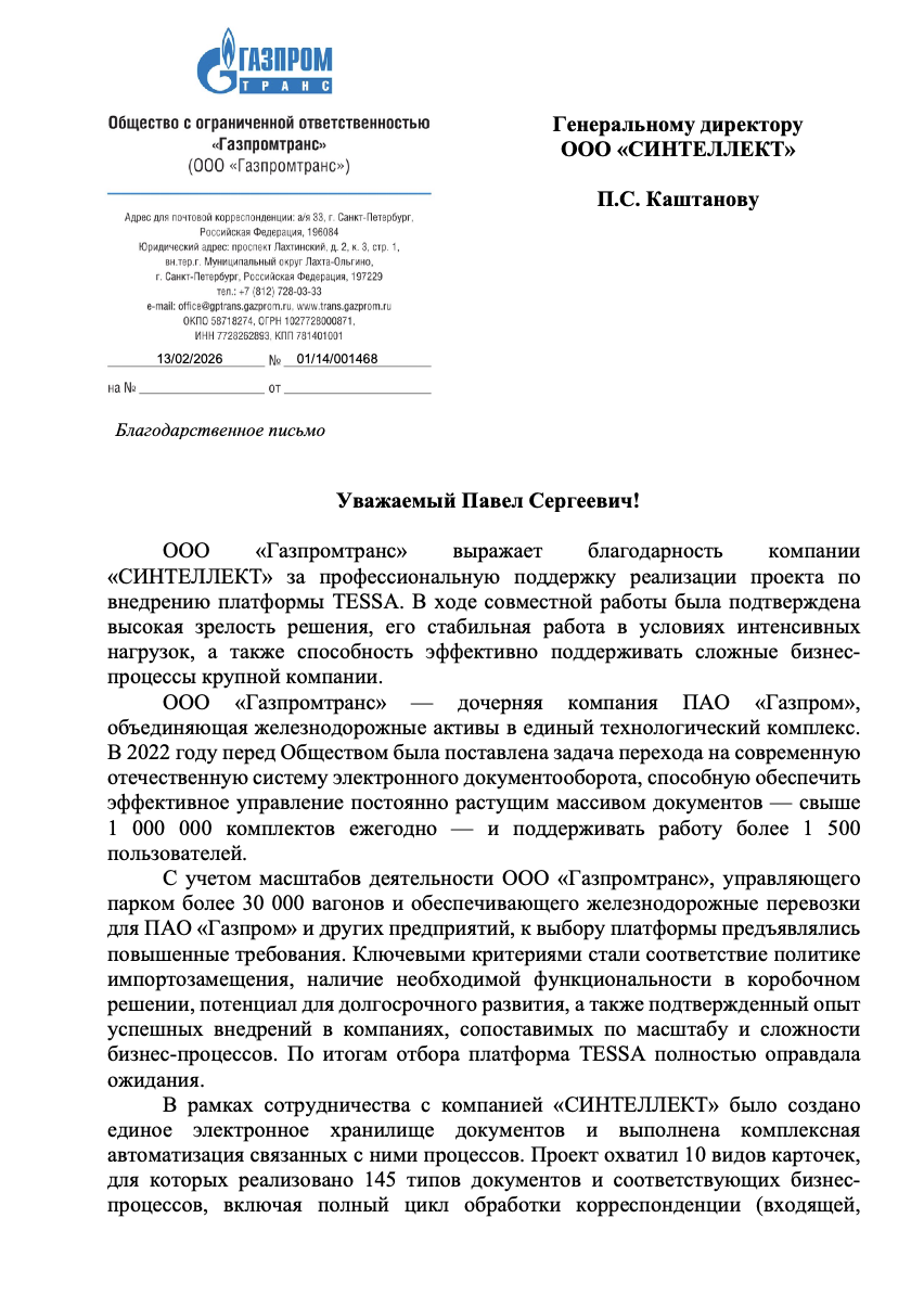 ООО «Газпромтранс» выражает благодарность компании «СИНТЕЛЛЕКТ» за профессиональную поддержку реализации проекта по внедрению платформы TESSA. В ходе совместной работы была подтверждена высокая зрелость решения, его стабильная работа в условиях интенсивных нагрузок, а также способность эффективно поддерживать сложные бизнес- процессы крупной компании.