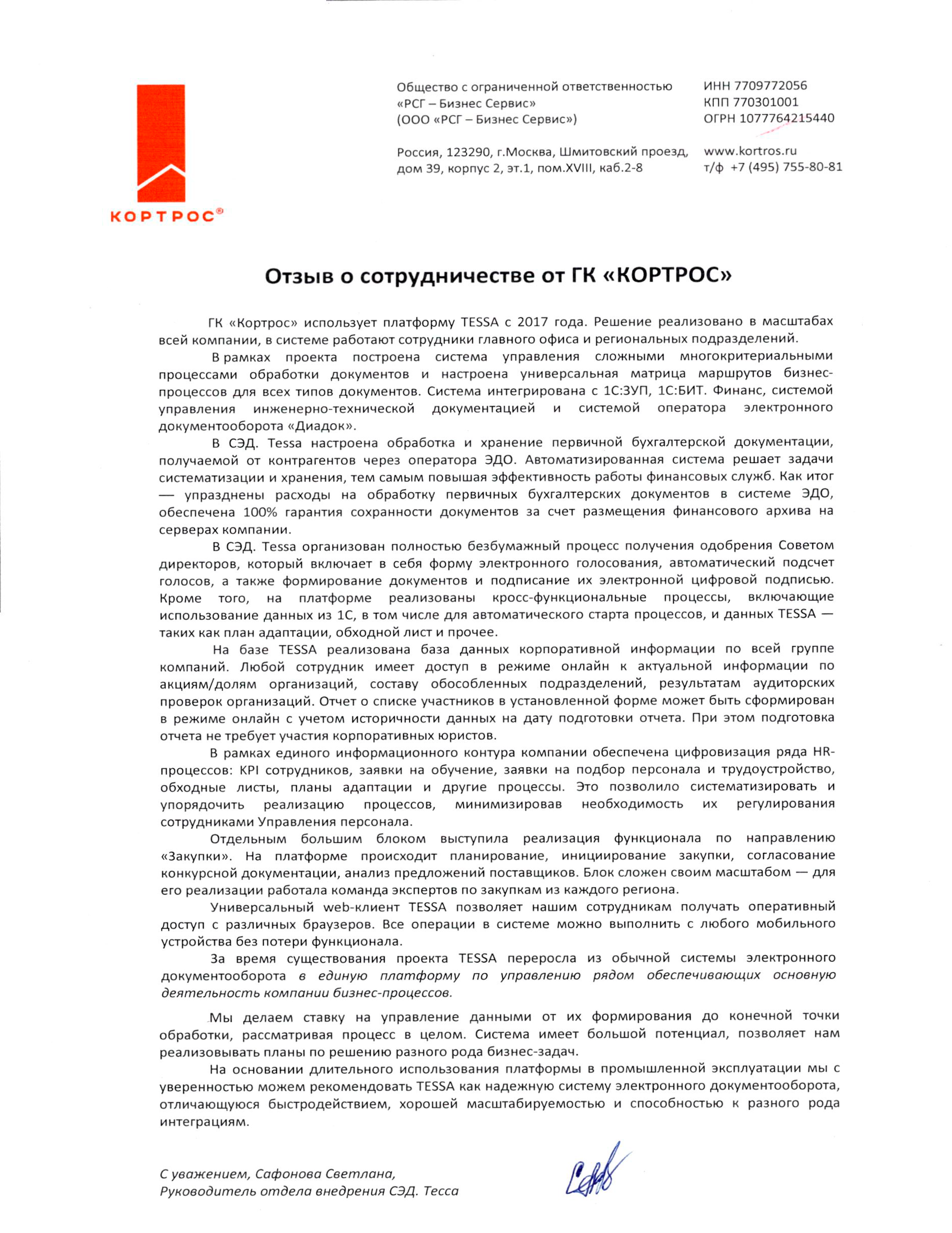ГК «КОРТРОС» использует платформу TESSA с 2017 года. Решение реализовано в масштабах всей компании, в системе работают сотрудники главного офиса и региональных подразделений.