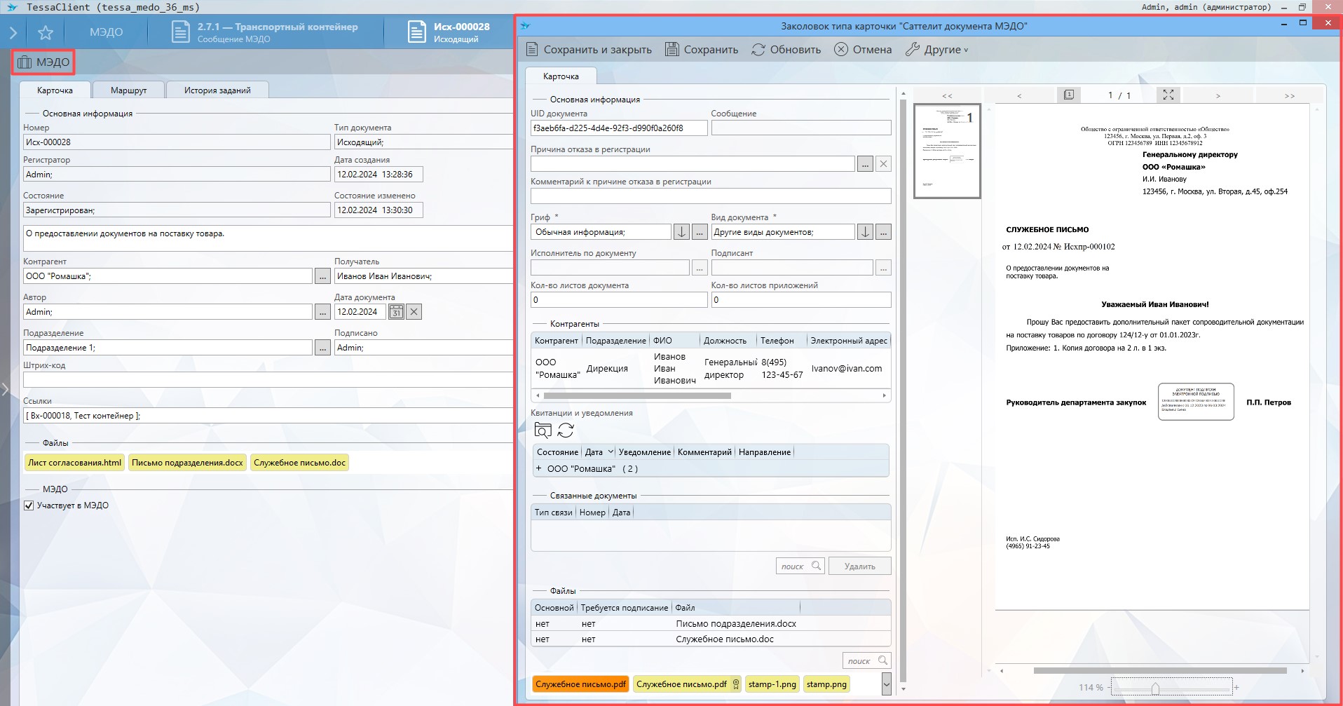Кроме этого, в карточке сообщения МЭДО можно получить более подробную информацию о сообщении: состав, валидация данных, ссылка на созданную карточку документа.