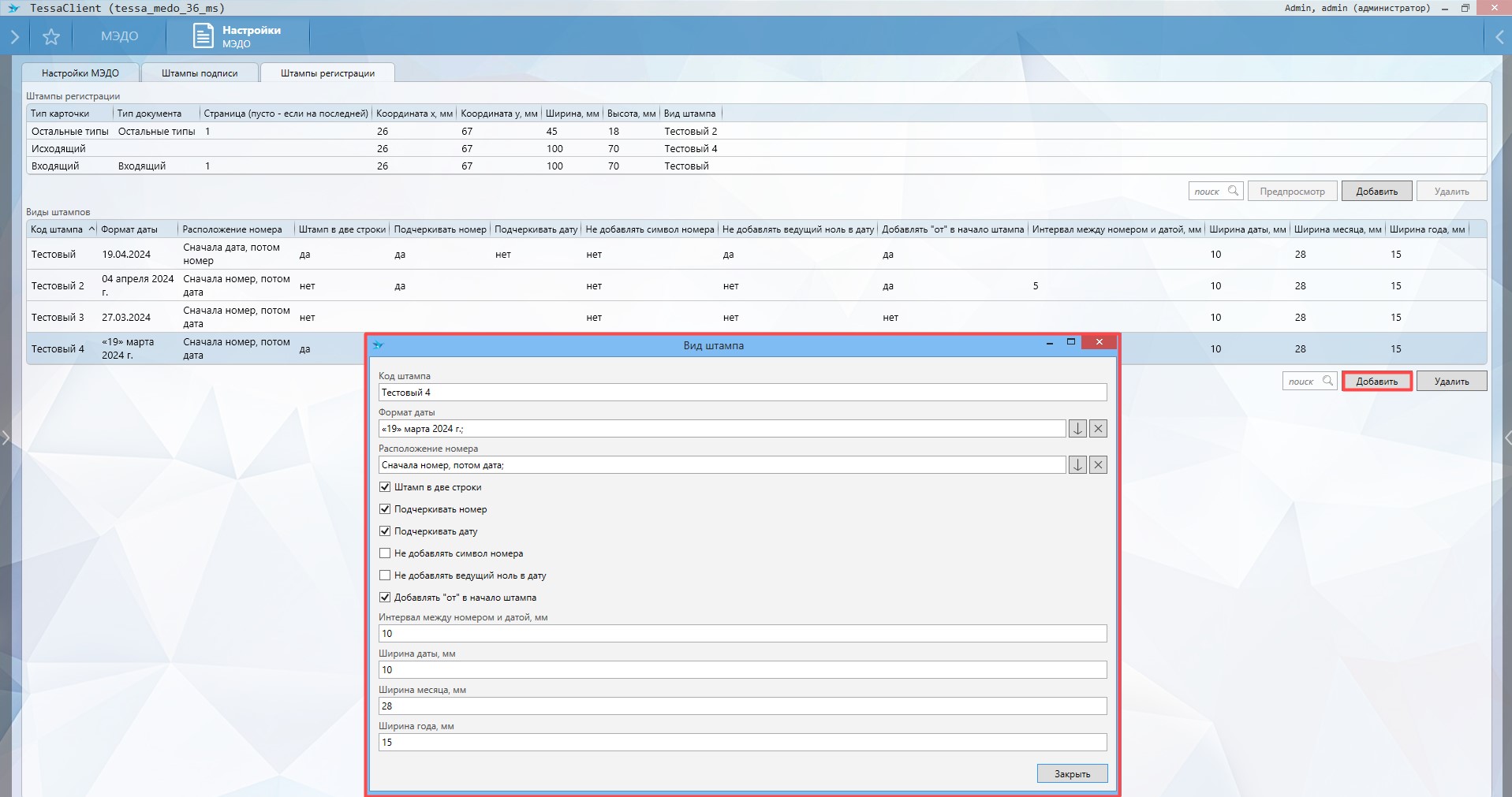 Для определения координат и вида штампа регистрации используется карточка настроек МЭДО. Система позволяет регулировать не только координаты расположения штампа на документе, но и его настройки:
