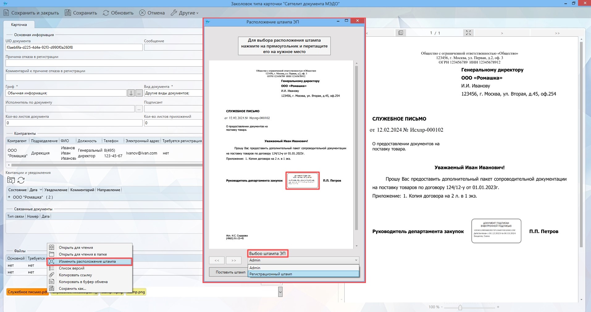 Если расположение штампа в конкретном документе необходимо изменить, предусмотрен инструмент перемещения штампов непосредственно в визуальном отражении документа: