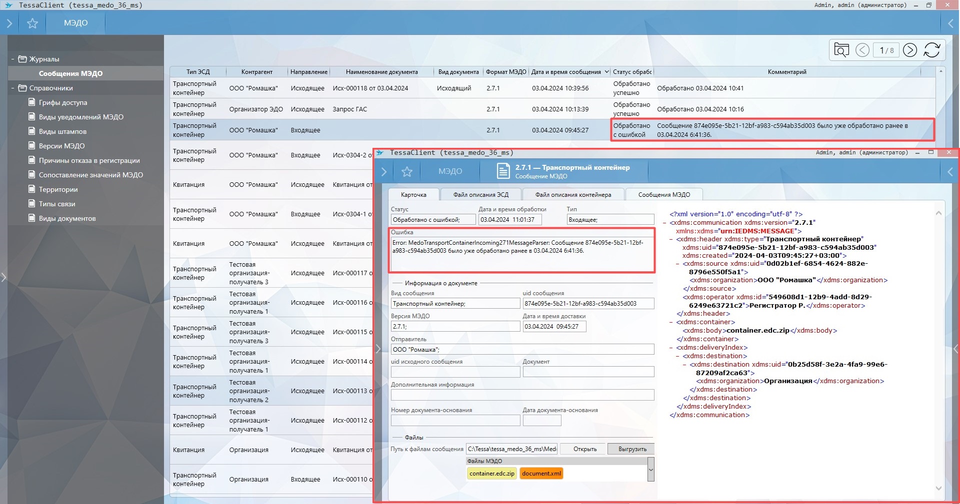 В модуле предусмотрен журнал «Сообщения МЭДО»